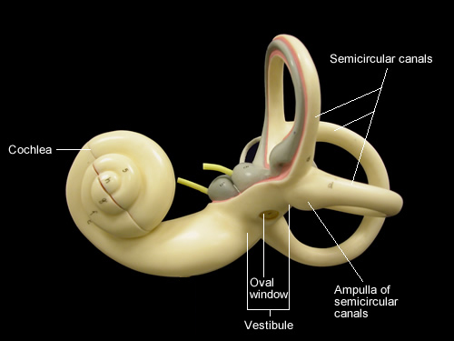 The balance organs of the inner ear, which make up the vestibular labyrinth, are made up of three semicircular canals and the vestibule, which consists of two otolith organs, the utricle (closer to the semicircular canals) and saccule (closer to the cochlea). Angular acceleration is sensed by the latter, static head position, in relation to the planet’s gravitational fields, and linear acceleration by the former.